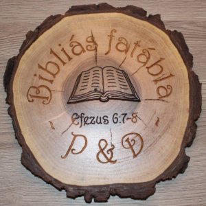 A nyár folyamán egyre többet foglalkoztam a táblakészítés fejlesztésével, így napjainkig már egy kidolgozott kis „gyártósoron” készül a Bibliás fatábla. A készítés során egyszer vesszük igénybe a számítógépes szövegszerkesztőt, a többi 17 munkafolyamat mind kézi munka, mely során természetesen elektromos gépeket is használunk. Bükk, cseresznye, éger, juhar, fekete dió, kerti dió, körte, kőris és tölgy (9) fafajokból készül az 54 féle fatábla. Minden táblánk természetes keményviaszos olajjal van felületkezelve, így kisgyermekek kezébe kerülve sem okozhat problémát.Gyakran kijön hozzánk a műhelybe kisebbik fiunk Keve. Ő már önállóan készített egy-két táblát, Csanád fiam a számítógépes feladatokban vette ki részét, Emese a legkisebb pedig szívesen adja kéz alá a csomagolóanyagokat.Nagyon szeretjük Isten igéjét fára írni, közben jól el lehet mélyülni az üzenetében.